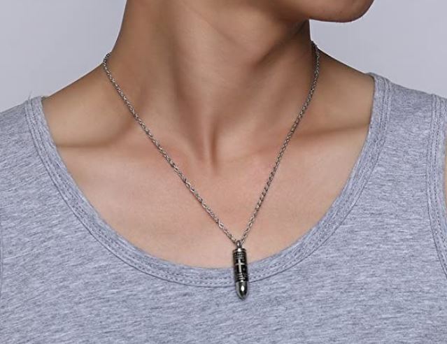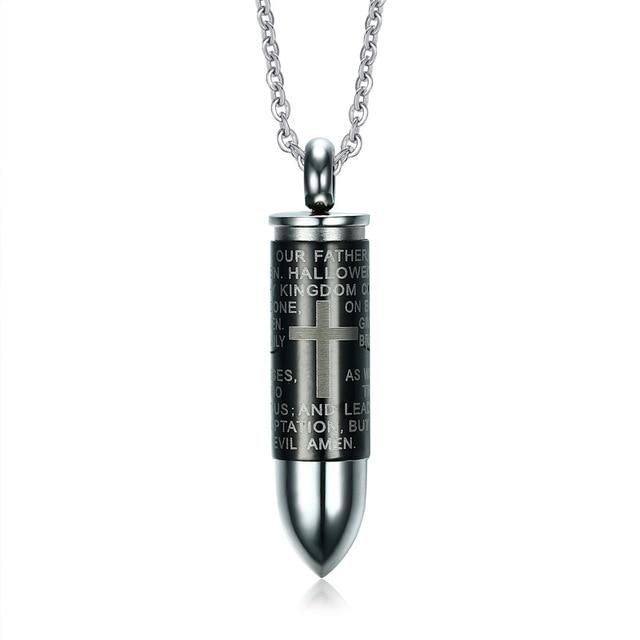 El collar de urna de cremación Black Bullet grabado con una cruz y el Padrenuestro es la manera perfecta de mantener cerca a nuestros seres queridos y recordarnos la fuerza de nuestra fe. El collar tiene forma de bala sólida. Al otro lado del frente de la bala hay una cruz, que sirve como recordatorio del sacrificio de Jesucristo por todos nosotros. Alrededor de la cruz está grabado el Padrenuestro en el resto de la bala.