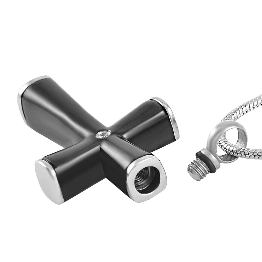 The Black Cross With Gemstone Cremation Urn Necklace is the perfect balance of remembrance and peace. The cross of this ash necklace stands firm as a memento of your loved ones life and work, inspiring respect and admiration.  The gemstone in the center shines brightly forth, catching every ray of light. This necklace fosters a sense of comfort and reflection while holding your loved one close. Remember their deeds, honor their life, and feel their protection with the Black Cross With Gemstone Cremation Urn Necklace.