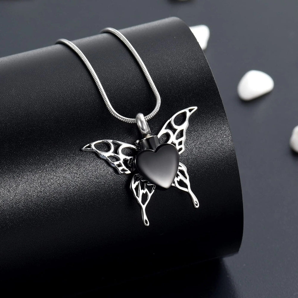 Butterfly Cremation Necklace With Heart - Black is backordered and will ship as soon as it is back in stock.