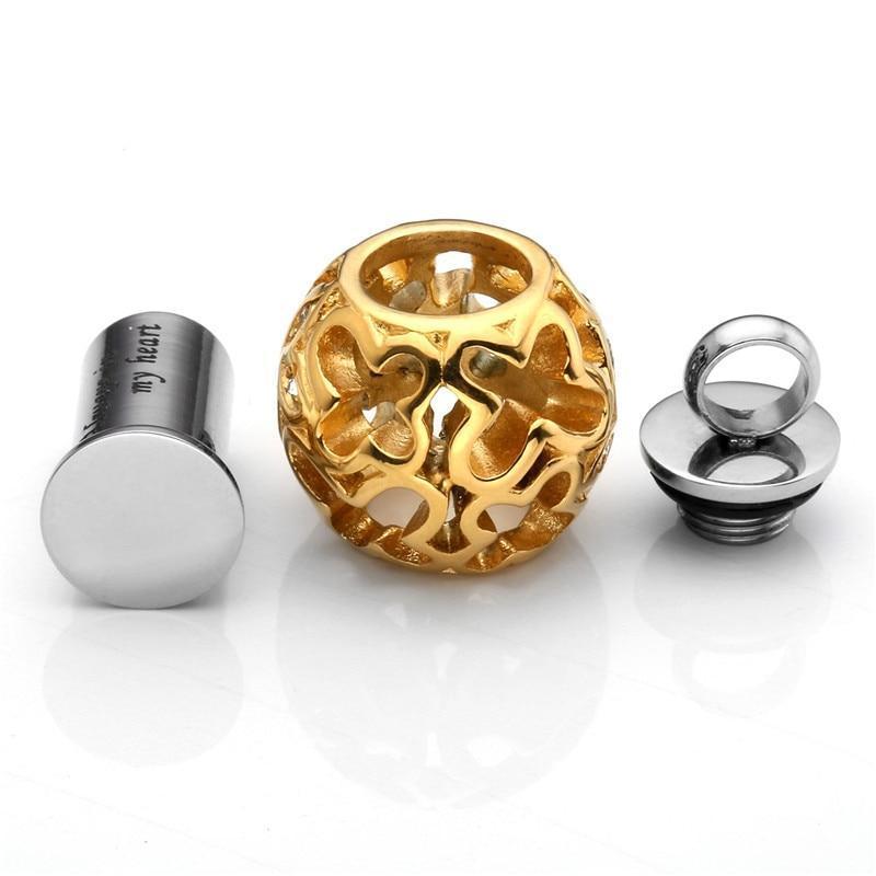 The ash necklace is a hollow spherical shape. All over the sphere are butterfly shaped cut outs. Inside the hollow sphere is a container for your loved ones ashes. The butterfly represents your dearly departed as one who embraced life and learned all they could to fly. Embrace life and remember your loved one with the Golden Butterfly Flower Lantern Cremation Urn Necklace.
