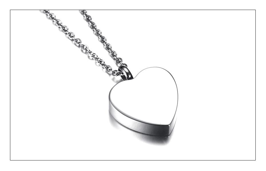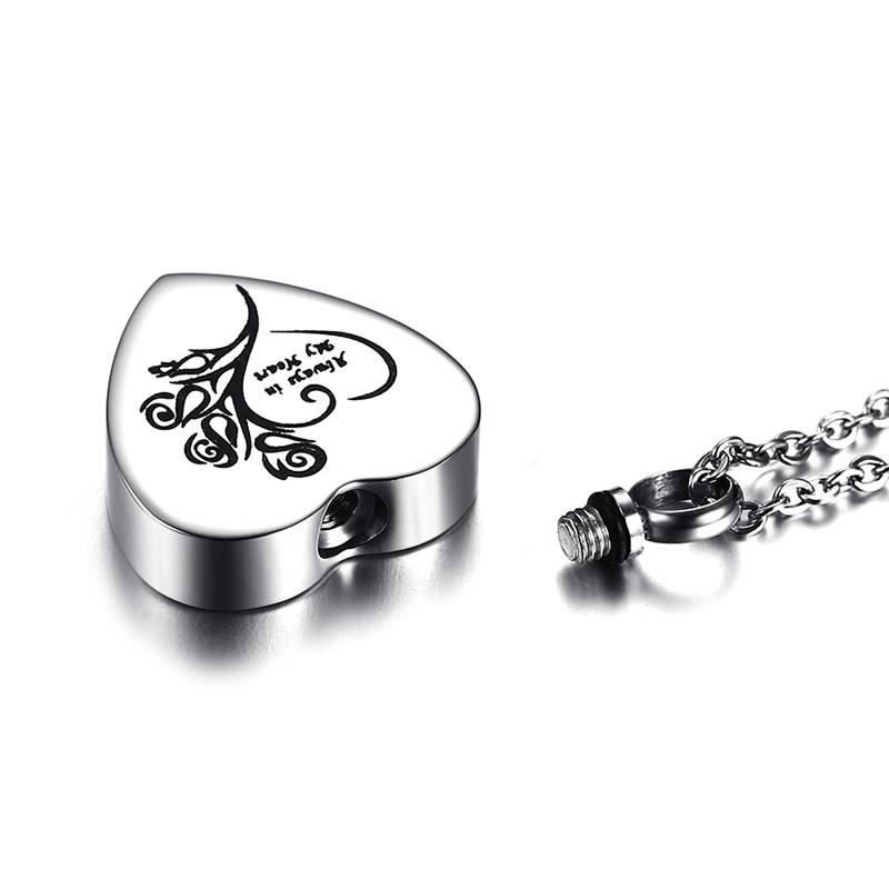 This ash necklace features a classic heart shaped design with a smaller heart etched upon it. Engraved on the piece is a classic sentiment, “Always In My Heart”. Along the right side of the heart engraving are four roses. This design focuses on the importance of your loved one and how they will always reside within your heart. Remember your loved one always with the Heart Shaped Cremation Urn Necklace Engraved With Roses & "Always In My Heart".