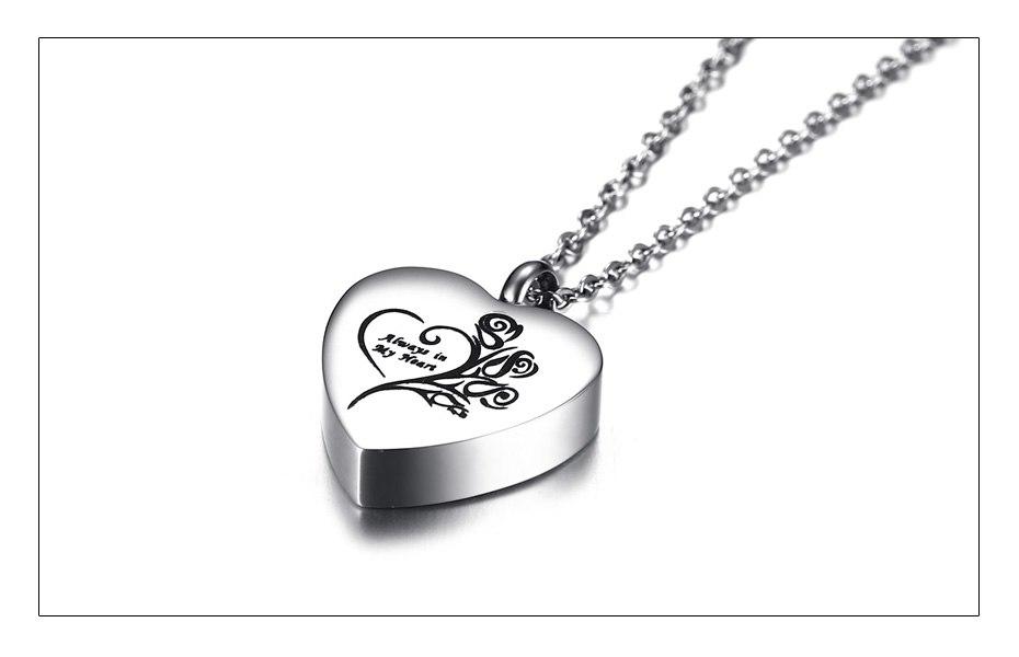Heart Shaped Cremation Urn Necklace Engraved With Roses & "Always In My Heart"