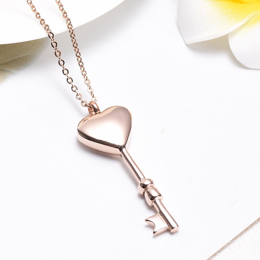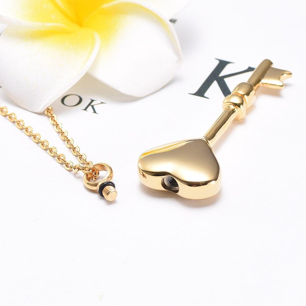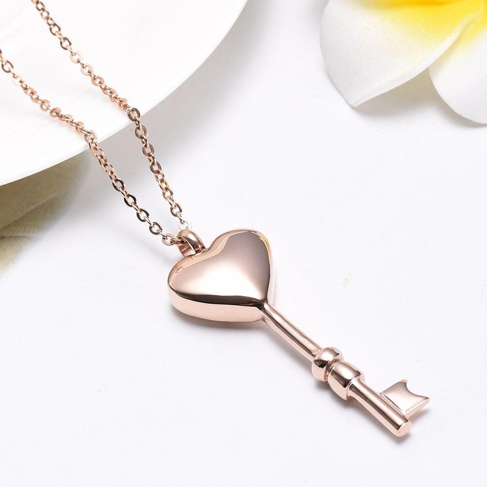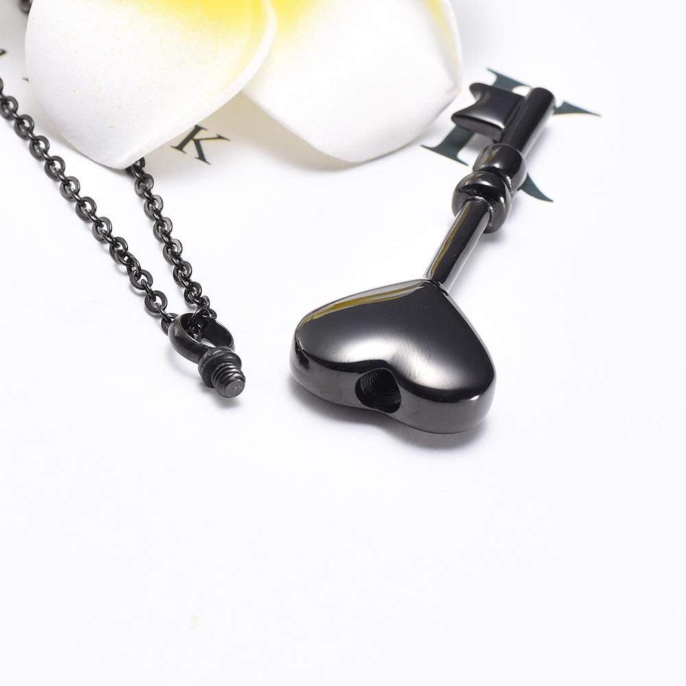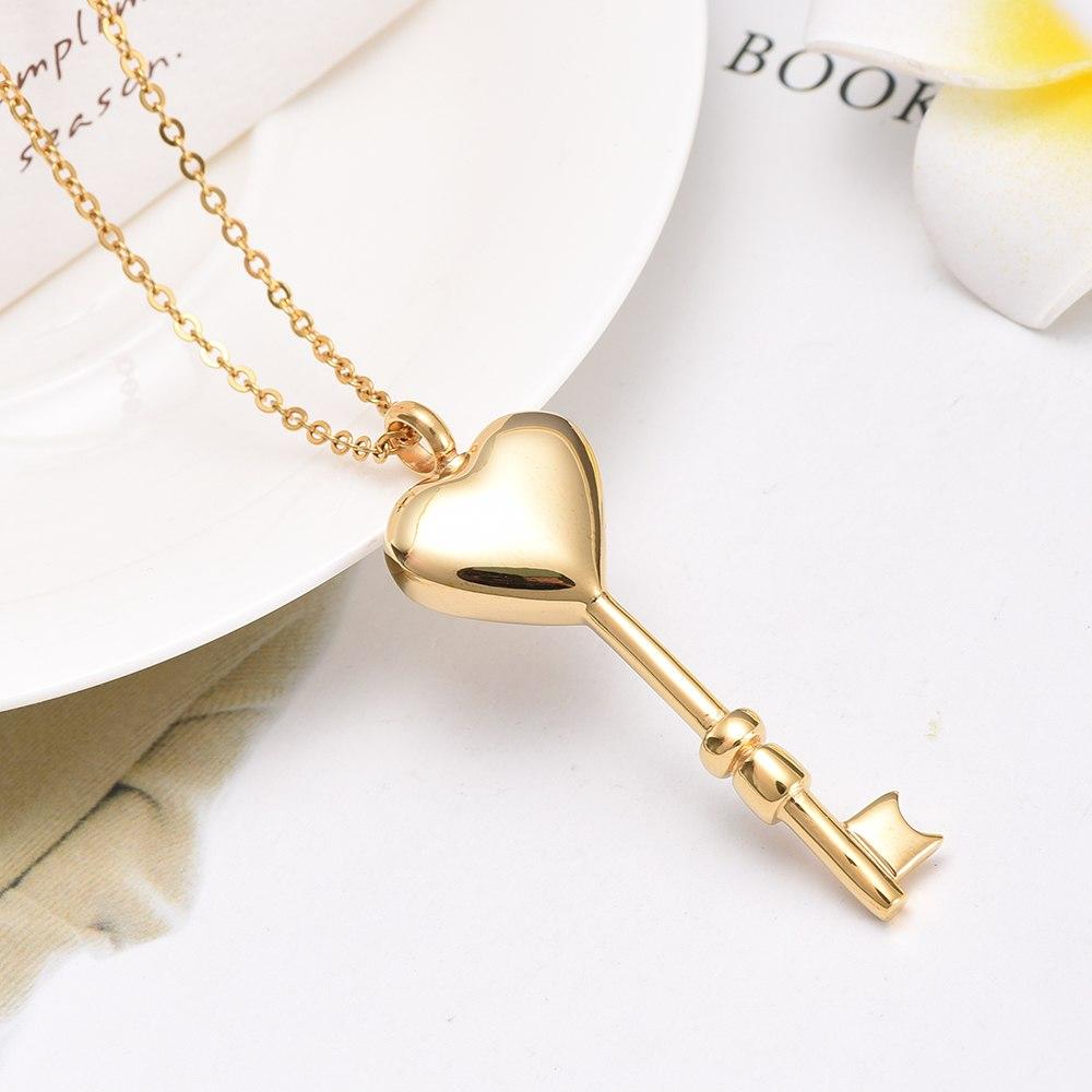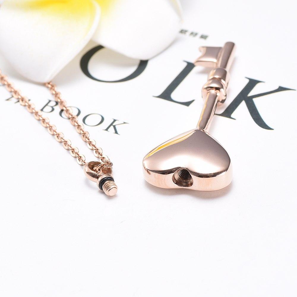 This ash necklace is a classic heart design. At the point of the heart there is a key. Honor and remember your loved one with the Heart Shaped Key Cremation Urn Necklace.