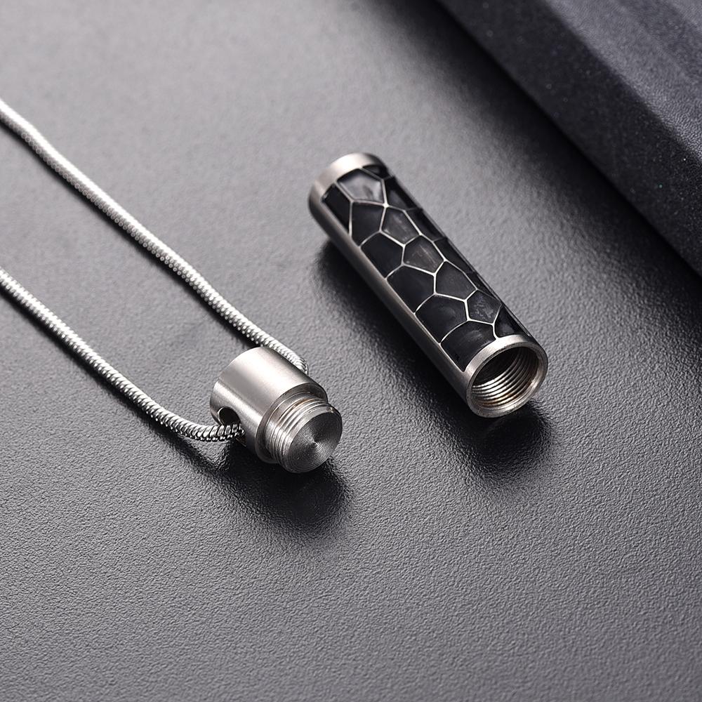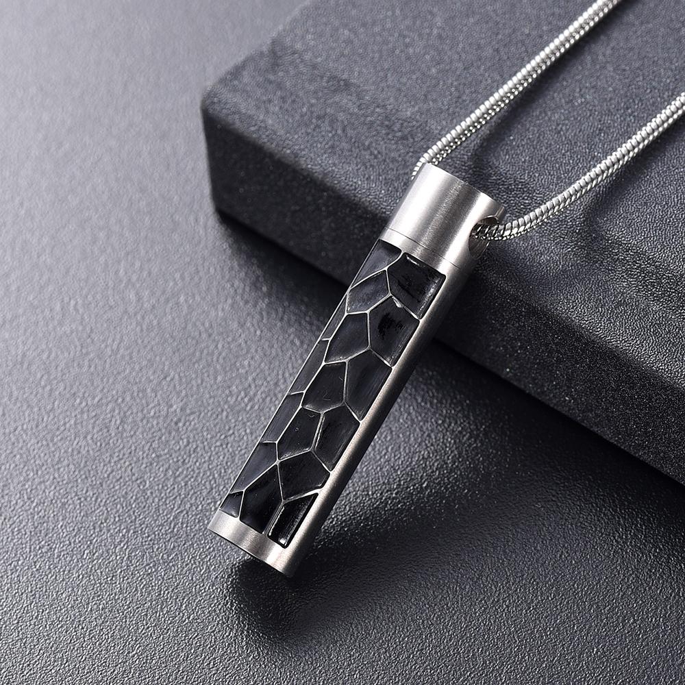 The ash necklace is a modern column shape. Etched across the column is a contemporary cross cut design. Embrace and hold your loved one close with the modernity of the Modern Silver Cylinder Memorial Urn.