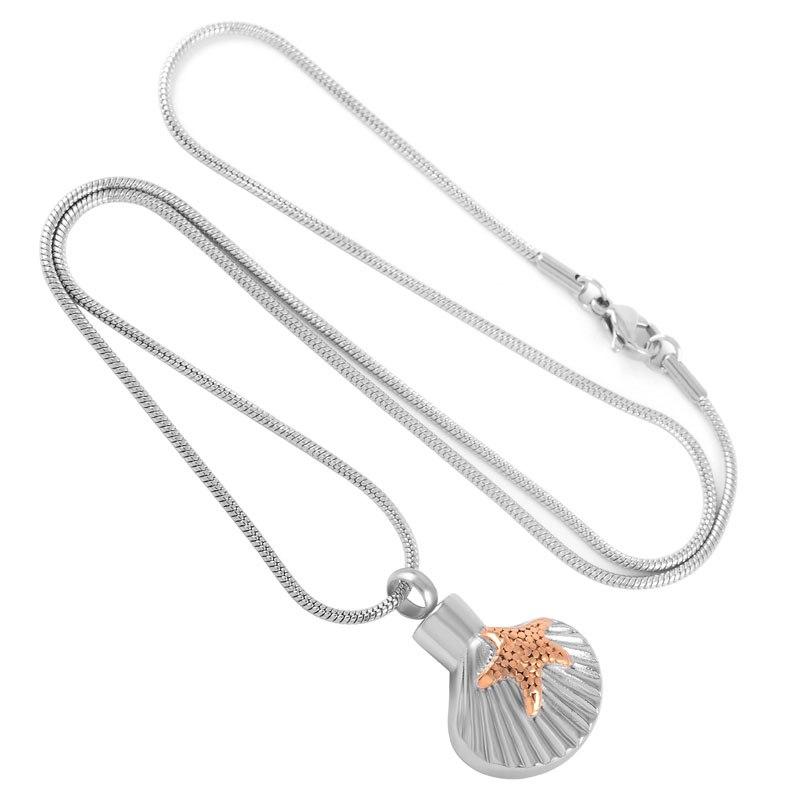 The pendant of this ash necklace is a beautiful, perfect, sea shell. Sprawled across the shell is a starfish. Both the seashell and starfish are etched with detail. Hold on to your sense of mystery and respect your loved one with the Sea Shell & Starfish Cremation Urn Necklace.