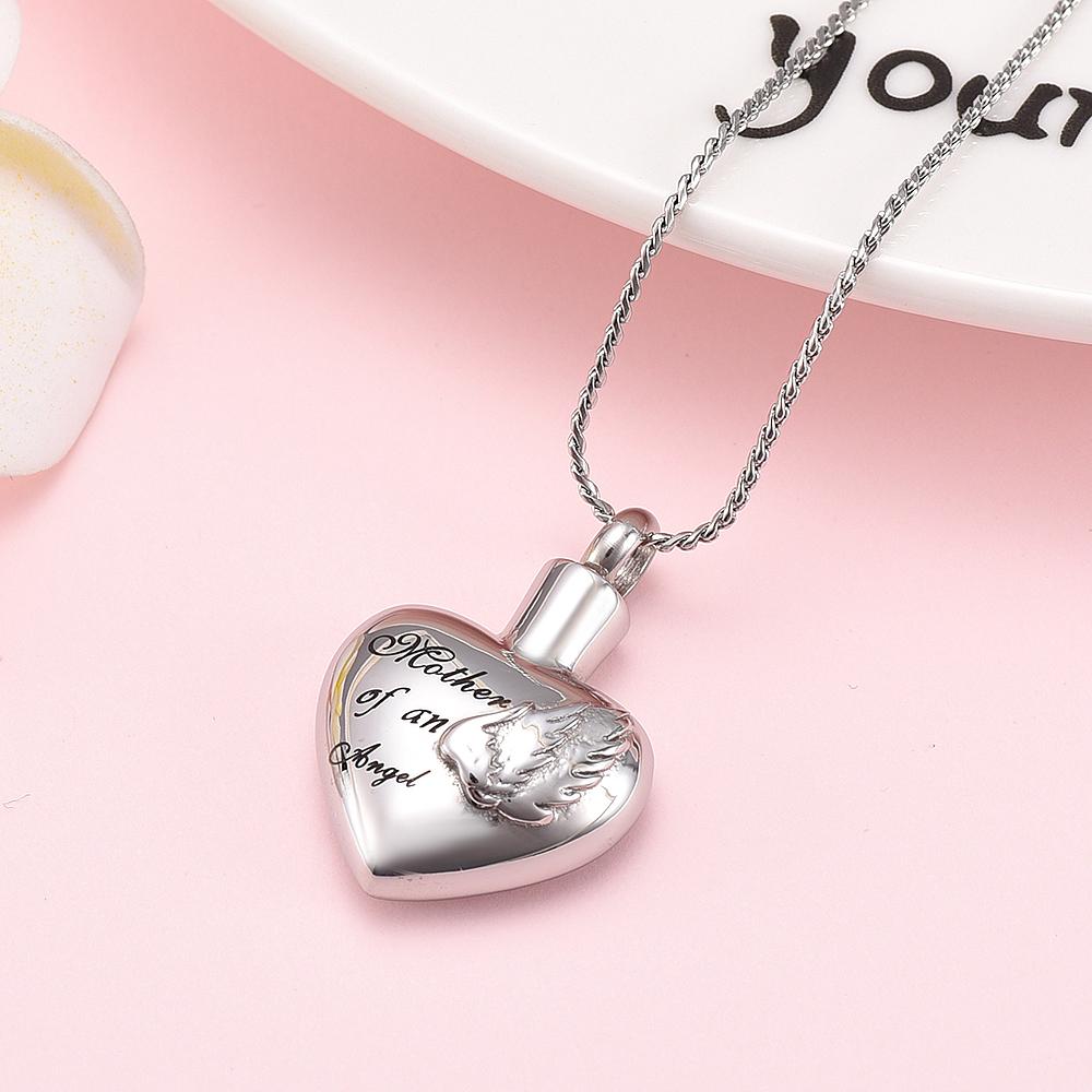 Silver Heart Shaped Cremation Urn Necklace With Angel Wings Engraved "Mother Of An Angel"