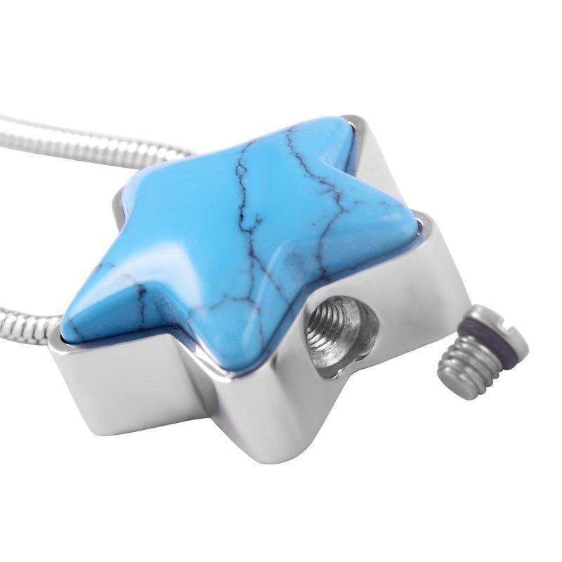 This is a silver star shaped cremation urn necklace with Turquoise. This cremation urn will hold and protect the ashes of your loved one & won't tarnish or lose it's finish over time.