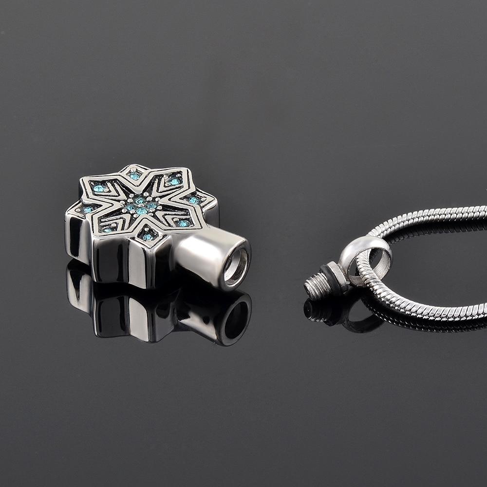 The pendant of this ash necklace is a distinctive snowflake. The snowflake is covered in shining rhinestones that catch the light and glisten. Always hold your loved one close and remember their uniqueness with the Silver Snowflake Cremation Urn Necklace with Rhinestones.